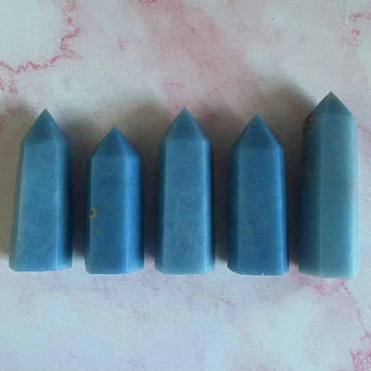 These towers weigh 66-88 grams, measure 2.5” – 3.13” in height, and are formed from natural Angelite.
